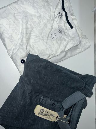 Polera de manga corta con estampado abstracto. - Cuello redondo. - Detalle de botón en manga. - Estampado en toda la prenda. Pack de 2 manisetas de hombre originales hollister talla L y petrolindustries talla M