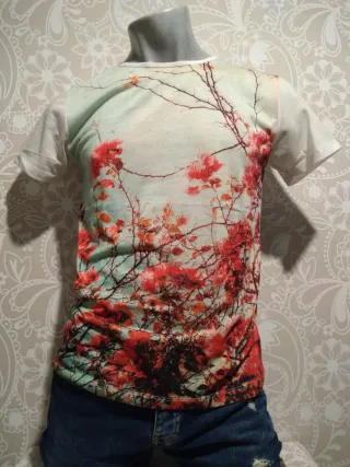 Camiseta de manga corta con un diseño vibrante de flores y ramas. El estampado cubre la parte frontal de la prenda. - Diseño floral detallado. - Mangas de color blanco. - Corte moderno. Talla M. Bastante estrecha para ser talla M, es más una talla S. Medidas: 47 cm de axila a axila. 66 cm largo.