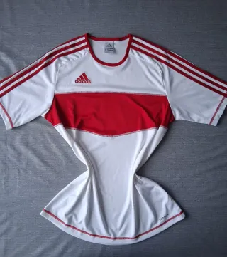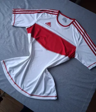 Camiseta deportiva Adidas con un diseño moderno y llamativo. - Mangas cortas. - Cuello redondo. - Detalles de rayas rojas en las mangas. - Costuras rojas decorativas en el bajo.