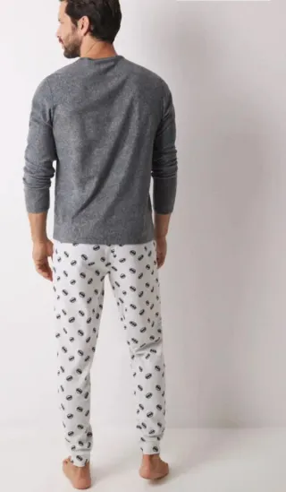 Conjunto de pijama para hombre con estampado de Batman. - Camiseta de manga larga gris. - Pantalón largo blanco con estampado de murciélagos.