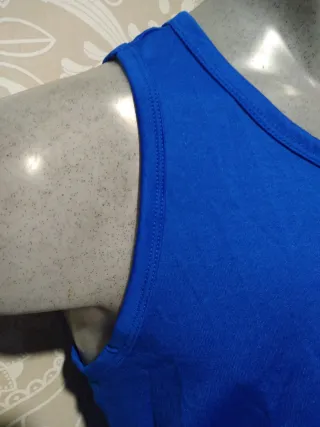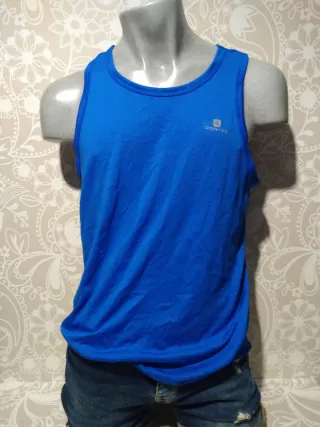 Camiseta sin mangas de la marca Domyos. - Tejido ligero y transpirable. - Diseño deportivo. - Cuello redondo. Talla L Medidas: 52 cm de axila a axila. 70 cm de largo.