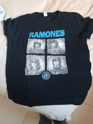 Camiseta negra con estampado de los Ramones. - Diseño frontal con los miembros de la banda. - Logo de la banda en la parte superior.
