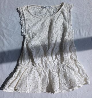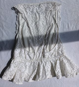 Modelo sin mangas con detalle de volantes en los hombros y acabado ondulado. Con efecto peplum que aporta vuelo. Espalda con abertura amplia y detalle central de encaje. Tejido ligero con forro interior. En buen estado general.