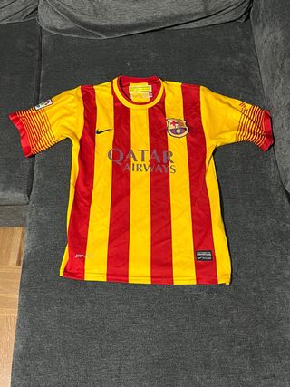 Camiseta de fútbol del FC Barcelona, usada por Neymar Jr. - Diseño a rayas rojas y amarillas. - Logo de Nike y escudo del club. - Patrocinio de Qatar Airways. - Tecnología Dri-FIT. - Talla 12 de niño.