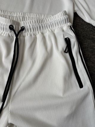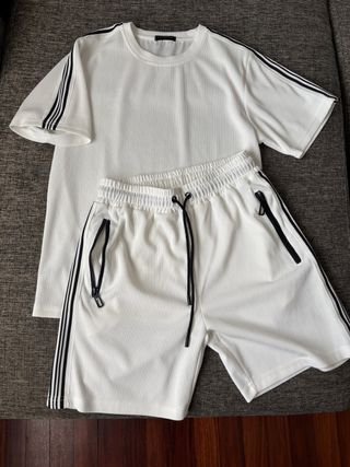 Conjunto de camiseta y pantalón corto de color crema. El tejido es ligero y con textura. - Camiseta de manga corta con detalles de rayas negras en las mangas. - Pantalón corto con cintura elástica y cordón. - Bolsillos laterales con cremallera en el pantalón corto. - Rayas negras a juego en los laterales de la camiseta y el pantalón.
