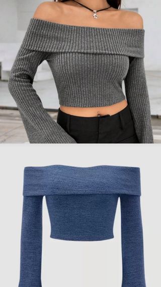 Conjunto de dos tops de hombros descubiertos. Están sin estrenar. - Diseño de canalé. - Tejido suave y elástico. - Mangas largas acampanadas.