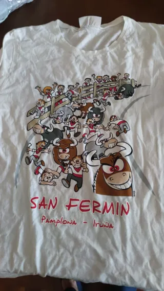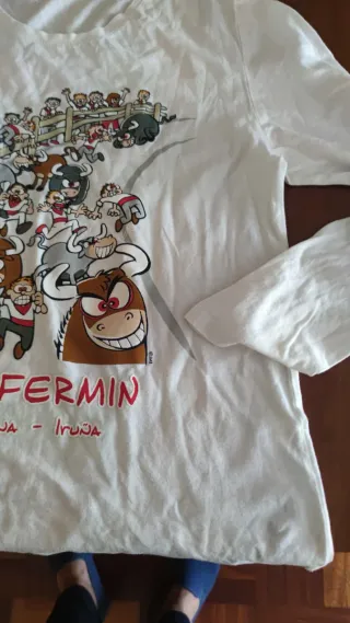 Camiseta con estampado de San Fermín en Pamplona. Ideal para coleccionistas o para revivir la fiesta. - Diseño con toros y corredores. - Texto San Fermín Pamplona - Iruña en la parte inferior. - Manga larga. Ancho hombro 32 cm. Largo 55 cm