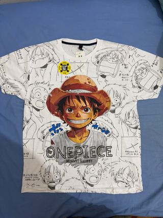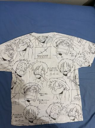 Camiseta blanca con estampado de Monkey D. Luffy de One Piece. - Diseño frontal a todo color de Monkey D. Luffy. - Estampado de bocetos y personajes de One Piece en toda la prenda. - Cuello redondo.