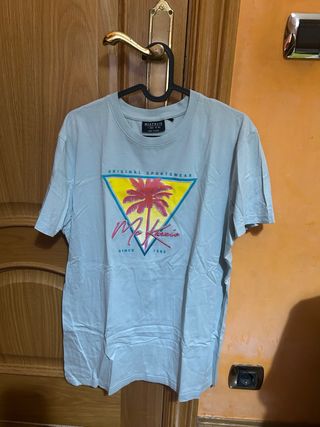 Camiseta mckenzie azul clarito con logo en la parte delantera por el pecho con una palmera en color amarillo y rosa en forma de triángulo talla m en buen estado