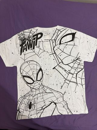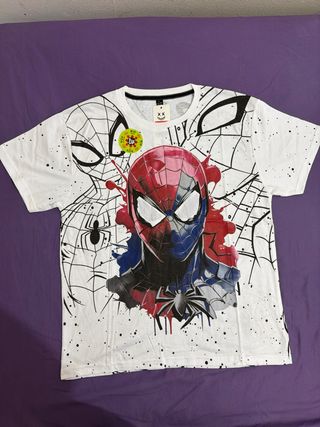 Camiseta blanca con un llamativo estampado de Spiderman. - Diseño frontal con Spiderman a todo color y silueta en negro. - Detalles de telarañas y salpicaduras. - Cuello redondo y manga corta.
