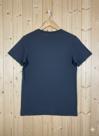 Camiseta gris oscuro/azulado de la marca La Tostadora, con un diseño inspirado en Robe de Extremoduro. - Estampado frontal y en la espalda, con el dibujo del hombre de Vitruvio tocando la guitarra. - Cuello redondo y manga corta. - Talla S (ver medidas en foto)