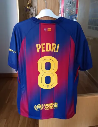 Camiseta de fútbol del FC Barcelona, temporada 2025-26, Pedri (8) - Diseño a rayas verticales rojas y azules. - Escudo del club en el pecho. - Logo de Spotify en el frontal. - Parche de la UEFA Foundation for Children en la manga. - Logo de Nike.