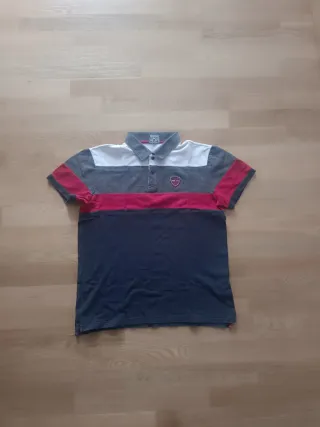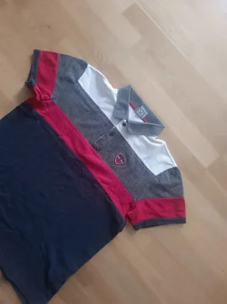 Polo de manga corta con diseño de bloques de color. - Cuello tipo polo con botones. - Detalle de escudo en el pecho. - Combinación de blanco, gris, rojo y azul marino.