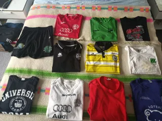 ME MUDO Y QUIERO DAR SALIDA A ESTAS PRENDAS 10 CAMISETAS + PANTALÓN CORTO DE REGALO TODO POR 30€ (NO NEGOCIABLE) TALLA M - Camiseta roja joma con logo Audi. - Camiseta verde con logo Sukan. - Camiseta negra con diseño de corazón. - Camiseta negra tipo polo con logo Luanvi. - Camiseta amarilla y blanca tipo polo Mercury. - Camiseta blanca con logo Abaste S.L. - Camiseta negra University Roma. - Camiseta blanca con logo Givova y Audi. - Camiseta roja. - Camiseta morada con texto Loteria.