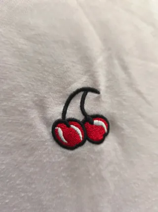 Camiseta de chico con un diseño divertido. - Estampado de dos cerezas bordadas en la parte delantera. - Cuello redondo. - Manga corta.