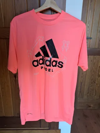 Camiseta deportiva Adidas de color naranja, ideal para pádel. - Diseño con logo de Adidas y temática de pádel. - Tejido técnico transpirable.