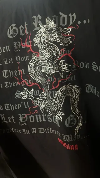 Camiseta negra con un diseño llamativo de dragón. - Estampado de dragón en estilo gótico. - Detalles en plateado y rojo. - Texto en la parte superior e inferior.