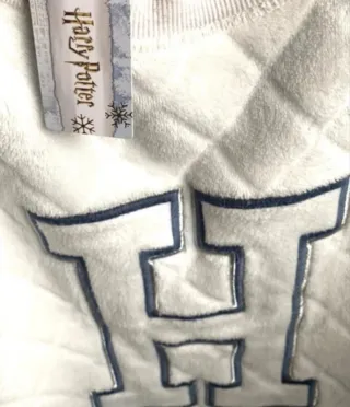 Conjunto de pijama de dos piezas con temática de Hogwarts. - Sudadera blanca acolchada con logo H y texto HOGWARTS. Es muy agradable, la parte de arriba de tejido polar y el pantalón más fino, muy suave, con logos. Vale para una talla S/M, aunque ponga S da bastante talla. Medidas, camiseta hombro 50, axila 61, largo 58, pantalón cintura elástica da 33 hasta 46 retirada, largo 98. #pijamawomensecret #pijamawomensecretmujer #pijamawomensecretfemme #pijamawomensecretdonna #pijamawomensecret #pijamahogwarts #pijamahogwarts38 - Pantalón largo azul marino con estampado repetido de H y rombos.