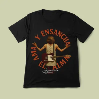 Camiseta negra con diseño gráfico. - Ilustración central con guitarra y texto. - Texto Ama y ensancha el alma y firma. - Estilo rockero.