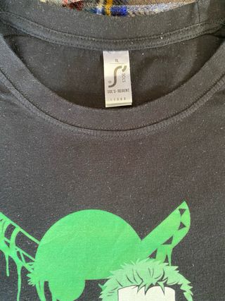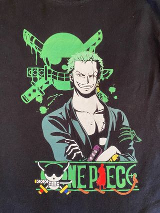 Camiseta con diseño de Zoro de One Piece. - Estampado frontal con Zoro y el logo de One Piece. - Diseño en color verde sobre fondo negro.
