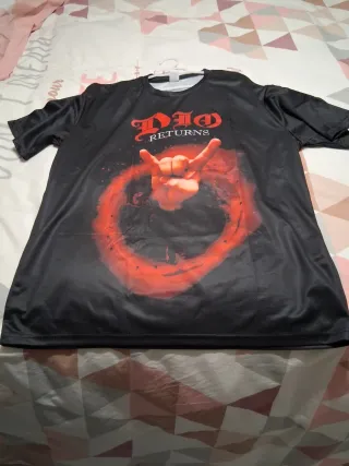 Camiseta con diseño de Dio Returns. - Estampado frontal con mano haciendo el signo rock on y aura roja. - Logo Dio Returns en la parte superior.