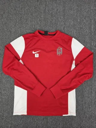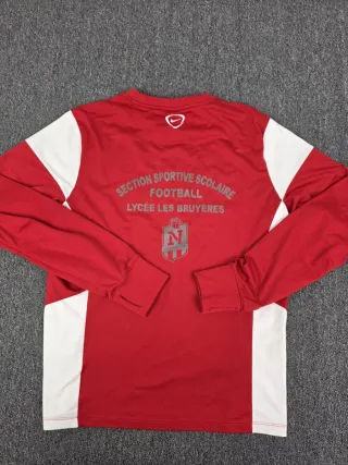 Camiseta deportiva **Nike original con tecnología Dri-Fit, diseñada para entrenamiento y fútbol. Modelo en color rojo con paneles blancos, tejido ligero y transpirable que ayuda a evacuar el sudor y mantener la comodidad durante la actividad deportiva. En la parte frontal presenta logo Nike y escudo, mientras que en la espalda lleva el texto “Section Sportive Scolaire Football – Lycée Les Bruyères”, lo que le da un estilo auténtico de equipación deportiva / training jersey. ✔ Tecnología Nike Dri-Fit ✔ Tejido técnico transpirable ✔ Diseño deportivo fútbol / entrenamiento ✔ Manga larga cómoda para deporte o uso casual