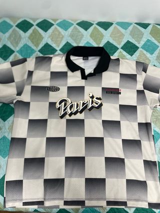 Camiseta de estilo retro con un diseño de cuadros y el nombre Paris. - Diseño de cuadros en blanco y negro. - Detalle de Paris en relieve. - Logo de STWD en la manga.