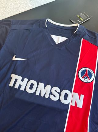 Camiseta de fútbol del Paris Saint-Germain (PSG) de la temporada 2002/2003, con el dorsal número 10 de Ronaldinho. - Diseño clásico con franja vertical roja. - Logo del club y patrocinador. - Mangas con detalles blancos.