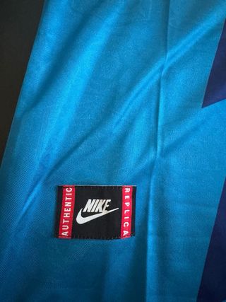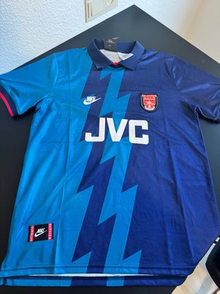 Camiseta retro del Arsenal de la temporada 1995/1996, modelo visitante. - Diseño con bloques de color azul y turquesa. - Rayos gráficos en contraste. - Logo de Nike bordado. - Escudo del Arsenal en el pecho.