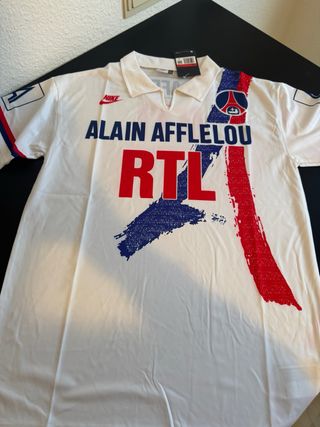 Preciosa Camiseta de fútbol vintage del Paris Saint-Germain de la temporada 1990/1991. - Diseño retro con detalles en rojo y azul. - Logo de Nike bordado. - Patrocinio de Alain Afflelou y RTL.