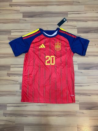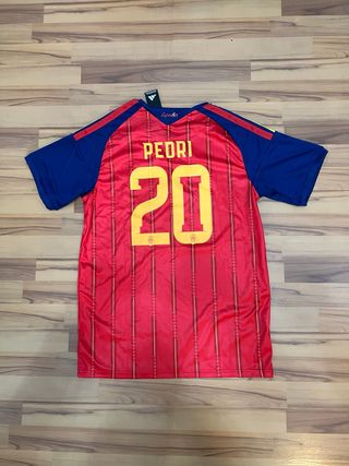 Camiseta de la selección española con el dorsal y nombre de Pedri. - Diseño a rayas verticales rojas y amarillas. - Mangas y cuello en azul. - Número 20 en la espalda.