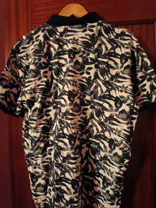 Polo con un llamativo estampado floral en tonos beige y negro. Ideal para un look casual y moderno. - Diseño de manga corta. - Cuello tipo polo.