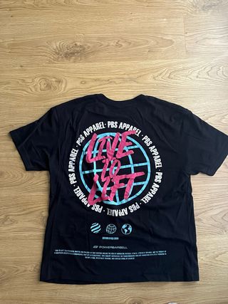 Camiseta negra de PBS Apparel con un diseño gráfico circular en la parte trasera. - Diseño Love to Lift con un globo terráqueo. - Estampado PBS Apparel alrededor del diseño. - Incluye Established 2020 y el logo de Powerbarbell.