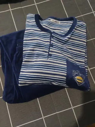 Conjunto de pijama para hombre con un diseño a rayas. - Camiseta de manga larga con cuello redondo y botones. - Pantalón largo a juego. - Detalle de bolsillo en la camiseta con estampado 'SPORT'. - Tejido suave y cómodo.