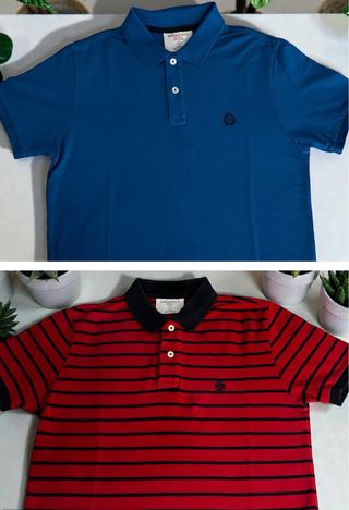 Dos camisetas tipo polo de manga corta para hombre Springfield Presentan un diseño con cuello y tapetes de dos botones. Color: - azul (original polo slim) - roja con rayas en azul marino (original polo) Talla: S (EUR, UK, KOR) Corte: slim Pequeño logo Springfield en el pecho Estado: como nuevas, un solo verano. Tienen 10 usos como mucho, ya que cogí peso y se quedaron pequeñas. Envío activado, pero puedo: - entregar en Móstoles - entregar en Usera (Madrid) exclusivamente los viernes de 15h a 20h