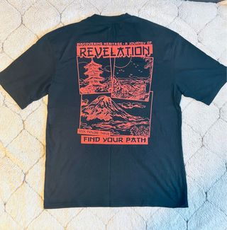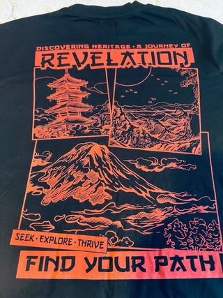 Camiseta negra con un diseño inspirado en el arte japonés. Presenta un estampado en tonos naranjas con elementos como pagodas, montañas y olas. - Diseño Revelation: Discovering Heritage, A Journey Of. - Frases Seek, Explore, Thrive y Find Your Path. - Estampado detallado con motivos orientales.