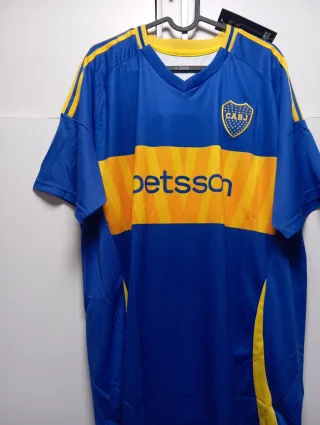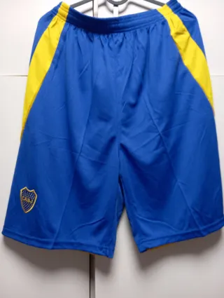 Conjunto deportivo para hombre con un diseño llamativo. - Camiseta con cuello en V. - Detalles de rayas en las mangas. - Escudo del equipo en el pecho. - Banda horizontal con logo en la parte frontal.