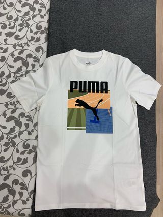 Camiseta blanca de la marca Puma con un diseño gráfico frontal y sin estrenar. - Logo de Puma en la parte delantera. - Diseño con bloques de color y silueta de guepardo.