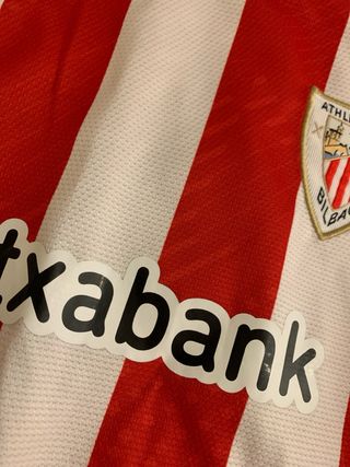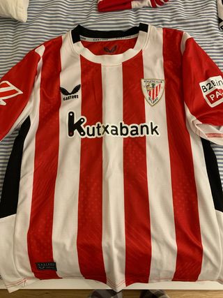 Camiseta FAKE del Athletic Club de Bilbao. - Diseño a rayas rojas y blancas. - Logo de Castore en el pecho. - Escudo del club. - Patrocinador Kutxabank.