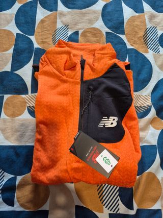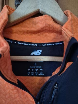 Camiseta de manga larga New Balance Running - Color naranja y negro. - Talla L. - Fabricada en Vietnam.