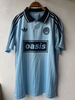 Camiseta de estilo retro con el logo de Oasis y las icónicas tres rayas de Adidas. - Diseño en color azul claro. - Cuello tipo polo con botones. - Logo de Adidas en el pecho. - Estampado grande de Oasis en la parte frontal.