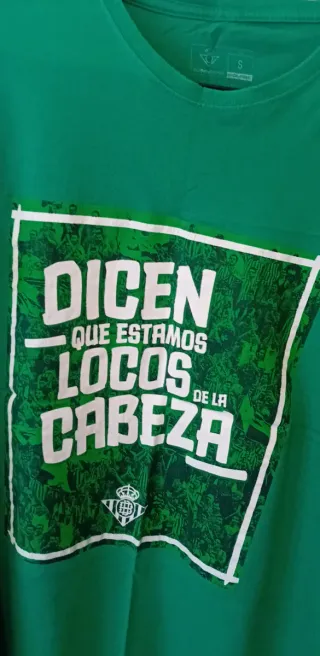 Camiseta oficial del Betis con un diseño llamativo. - Talla S. - Color verde. - Estampado frontal con el lema Dicen que estamos locos de la cabeza y el escudo del club.