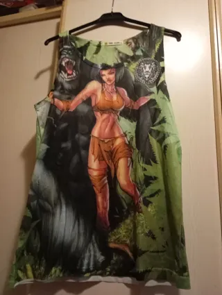 Camiseta sin mangas con un llamativo estampado. - Diseño con un gorila y una figura femenina. - Estampado integral con motivos selváticos y un león. - Tejido ligero y transpirable.