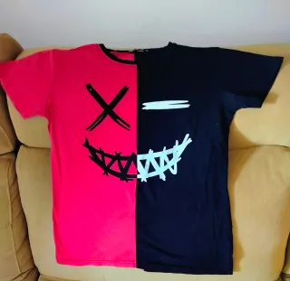 Camiseta de manga corta con un diseño llamativo. - Diseño dividido en dos colores: rojo y negro. - Estampado frontal de cara con diseño de sonrisa y ojos. - Cuello redondo.