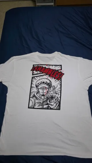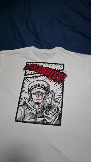 Camiseta blanca con diseño del personaje Law de One Piece. - Talla XL. - Ilustración estilo cómic con el texto SHAMBLES!. - Manga corta.