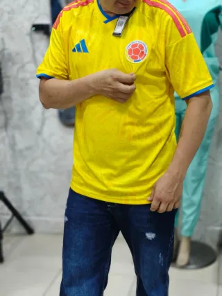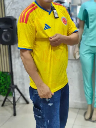 Camiseta deportiva de la selección de Colombia. - Diseño con los colores representativos del equipo. - Detalles de las tres franjas de Adidas en las mangas. - Escudo de la Federación Colombiana de Fútbol en el pecho.