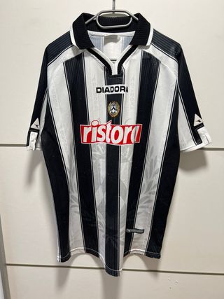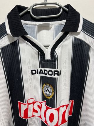 Camiseta de fútbol vintage del Udinese Calcio. - Diseño a rayas verticales. - Logo de Diadora. - Patrocinador Ristora.