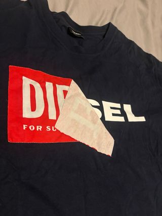 Camiseta de la marca DIESEL con un diseño llamativo. - Parte frontal con logo DIESEL en rojo y blanco. - Detalle de tela superpuesta en el logo. The material is in perfect condition – thick cotton, no pilling, no discoloration under the armpits or on the collar.