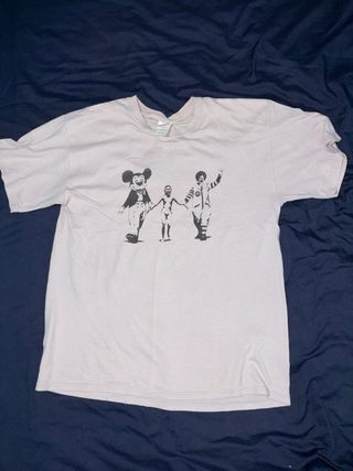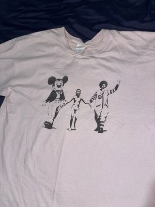 Camiseta con estampado inspirado en Banksy. - Diseño con Mickey Mouse, Ronald McDonald y una figura central. - Estampado en color negro sobre fondo rosa claro.