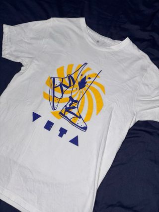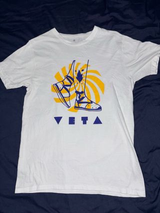 Camiseta blanca con un diseño inspirado en la tradición valenciana. - Estampado con motivos florales y calzado tradicional. - Detalle de la palabra VETA con elementos geométricos.